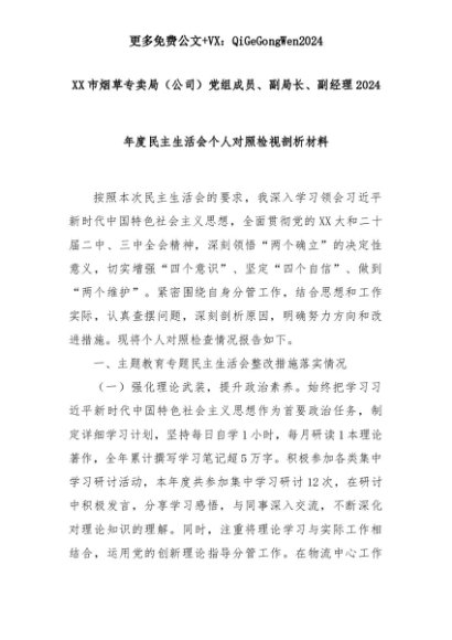 【七哥公文】2025年:XX市烟草专卖局(公司)党组成员、副局长、副经理2024年度民主生活会个人对照检视剖析材料+更多免费公文+VX:QiGeGongWen2024+更多免费公文+VX:QiGeGongWen2024