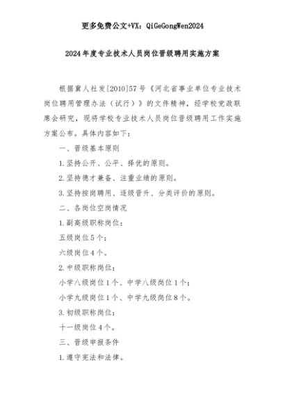 【七哥公文】2025年:2024年度专业技术人员岗位晋级聘用实施方案+更多免费公文+VX:QiGeGongWen2024+更多免费公文+VX:QiGeGongWen2024
