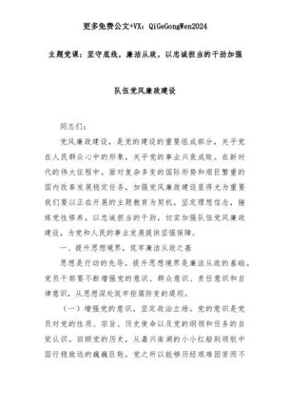 【七哥公文】2025年:主题党课:坚守底线,廉洁从政,以忠诚担当的干劲加强队伍党风廉政建设+更多免费公文+VX:QiGeGongWen2024+更多免费公文+VX:QiGeGongWen2024