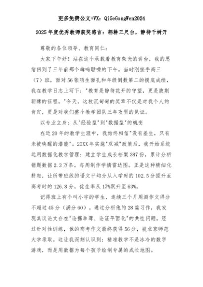 【七哥公文】2025年:2025年度优秀教师获奖感言:躬耕三尺台,静待千树开+更多免费公文+VX:QiGeGongWen2024+更多免费公文+VX:QiGeGongWen2024