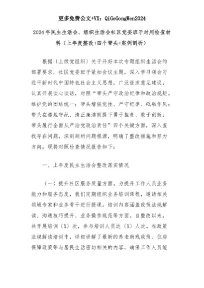 【七哥公文】2025年:2024年民主生活会、组织生活会社区党委班子对照检查材料(上年度整改+四个带头+案例剖析)+更多免费公文+VX:QiGeGongWen2024+更多免费公文+VX:QiGeGongWen2024