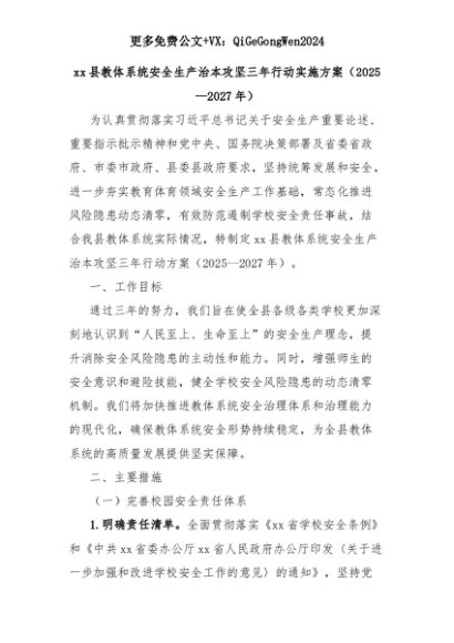 【七哥公文】2025年:xx县教体系统安全生产治本攻坚三年行动实施方案(2025—2027年)+更多免费公文+VX:QiGeGongWen2024+更多免费公文+VX:QiGeGongWen2024