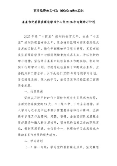 【七哥公文】2025年:某某市纪委监委理论学习中心组2025年专题学习计划+更多免费公文+VX:QiGeGongWen2024+更多免费公文+VX:QiGeGongWen2024
