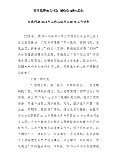 【七哥公文】2025年:市水利局2024年工作总结及2025年工作计划+更多免费公文+VX:QiGeGongWen2024+更多免费公文+VX:QiGeGongWen2024