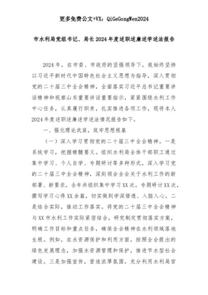 【七哥公文】2025年:市水利局党组书记、局长2024年度述职述廉述学述法报告+更多免费公文+VX:QiGeGongWen2024+更多免费公文+VX:QiGeGongWen2024