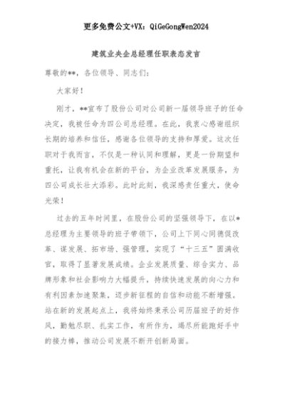 【七哥公文】2025年:建筑业央企总经理任职表态发言+更多免费公文+VX:QiGeGongWen2024+更多免费公文+VX:QiGeGongWen2024
