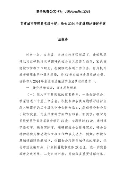【七哥公文】2025年:某市城市管理局党组书记、局长2024年度述职述廉述学述法报告+更多免费公文+VX:QiGeGongWen2024+更多免费公文+VX:QiGeGongWen2024
