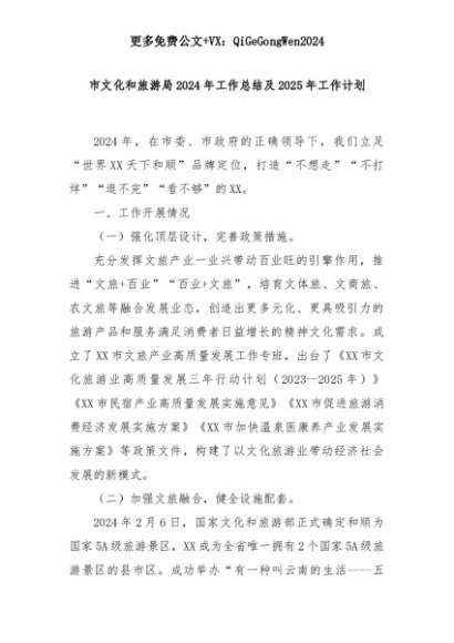 【七哥公文】2025年:市文化和旅游局2024年工作总结及2025年工作计划+更多免费公文+VX:QiGeGongWen2024+更多免费公文+VX:QiGeGongWen2024