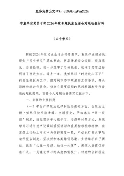 【七哥公文】2025年:市直单位党员干部2024年度专题民主生活会对照检查材料(四个带头)+更多免费公文+VX:QiGeGongWen2024+更多免费公文+VX:QiGeGongWen2024
