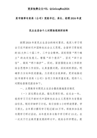 【七哥公文】2025年:某市烟草专卖局(公司)党组书记、局长、经理2024年度民主生活会个人对照检视剖析材料+更多免费公文+VX:QiGeGongWen2024+更多免费公文+VX:QiGeGongWen2024