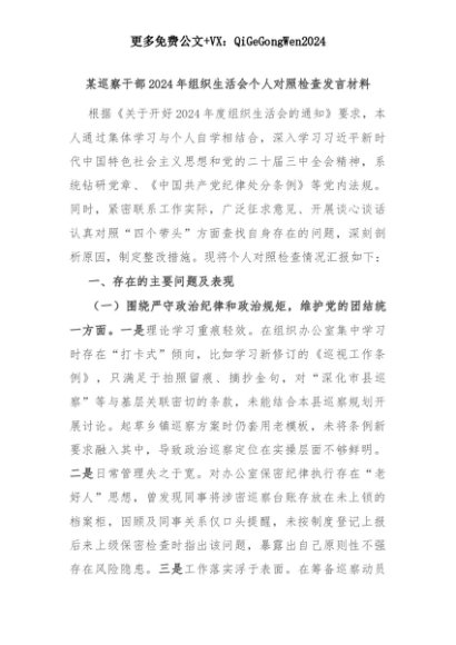 【七哥公文】2025年:某巡察干部2024年组织生活会个人对照检查发言材料+更多免费公文+VX:QiGeGongWen2024+更多免费公文+VX:QiGeGongWen2024
