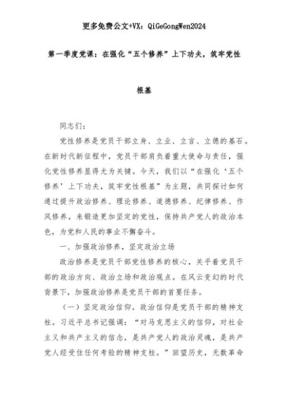 【七哥公文】2025年:第一季度党课:在强化“五个修养”上下功夫,筑牢党性根基+更多免费公文+VX:QiGeGongWen2024+更多免费公文+VX:QiGeGongWen2024