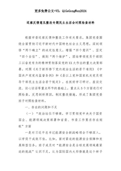 【七哥公文】2025年:巡察反馈意见整改专题民主生活会对照检查材料+更多免费公文+VX:QiGeGongWen2024+更多免费公文+VX:QiGeGongWen2024
