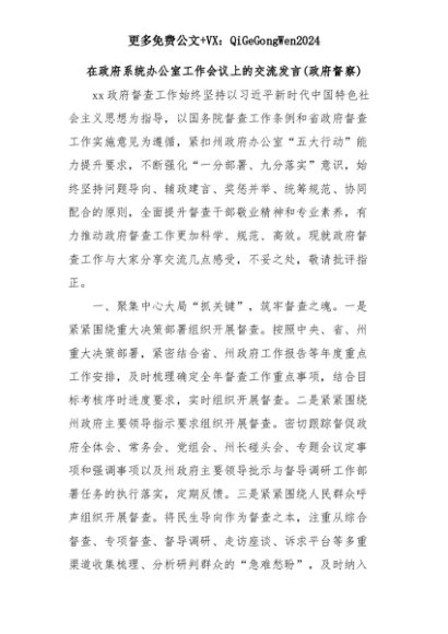 【七哥公文】2025年:在政府系统办公室工作会议上的交流发言(政府督察)+更多免费公文+VX:QiGeGongWen2024+更多免费公文+VX:QiGeGongWen2024