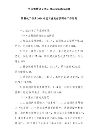 【七哥公文】2025年:区科技工信局2024年度工作总结及明年工作计划+更多免费公文+VX:QiGeGongWen2024+更多免费公文+VX:QiGeGongWen2024