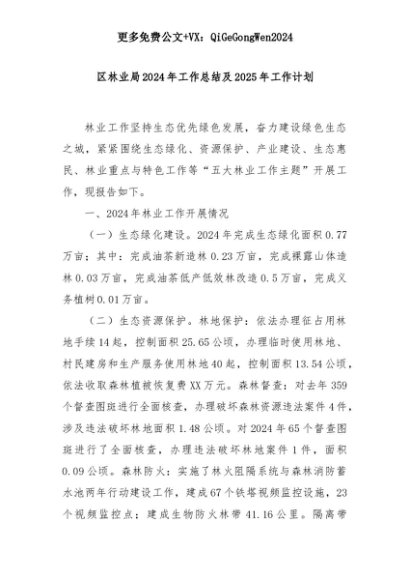 【七哥公文】2025年:区林业局2024年工作总结及2025年工作计划+更多免费公文+VX:QiGeGongWen2024+更多免费公文+VX:QiGeGongWen2024
