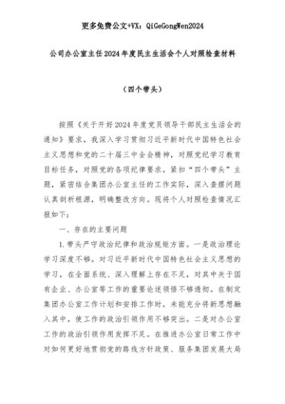 【七哥公文】2025年:公司办公室主任2024年度民主生活会个人对照检查材料(四个带头)+更多免费公文+VX:QiGeGongWen2024+更多免费公文+VX:QiGeGongWen2024