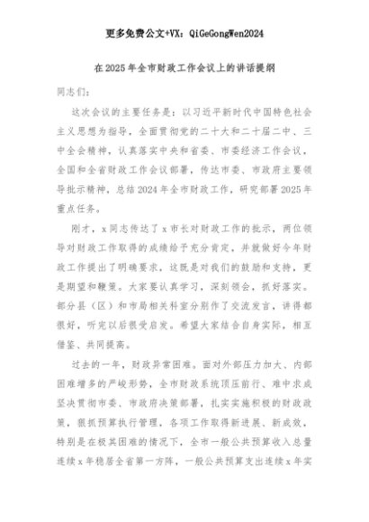【七哥公文】2025年:在2025年全市财政工作会议上的讲话提纲+更多免费公文+VX:QiGeGongWen2024+更多免费公文+VX:QiGeGongWen2024