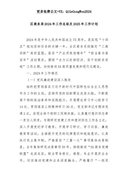 【七哥公文】2025年:区商务局2024年工作总结及2025年工作计划+更多免费公文+VX:QiGeGongWen2024+更多免费公文+VX:QiGeGongWen2024