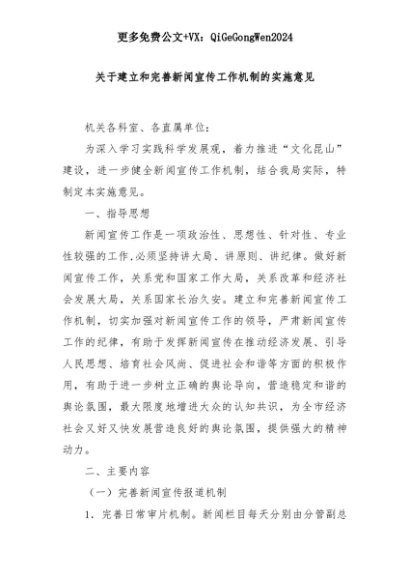 【七哥公文】2025年:关于建立和完善新闻宣传工作机制的实施意见+更多免费公文+VX:QiGeGongWen2024+更多免费公文+VX:QiGeGongWen2024