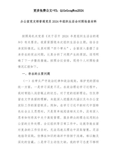 【七哥公文】2025年:办公室党支部普通党员2024年组织生活会对照检查材料+更多免费公文+VX:QiGeGongWen2024+更多免费公文+VX:QiGeGongWen2024