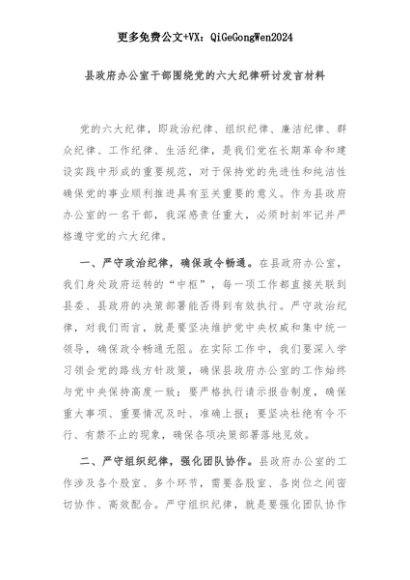 【七哥公文】2025年:县政府办公室干部围绕党的六大纪律研讨发言材料+更多免费公文+VX:QiGeGongWen2024+更多免费公文+VX:QiGeGongWen2024