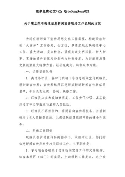 【七哥公文】2025年:关于建立荣巷街道信息新闻宣传联络工作机制的方案+更多免费公文+VX:QiGeGongWen2024+更多免费公文+VX:QiGeGongWen2024