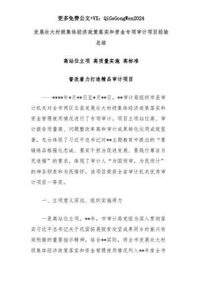 【七哥公文】2025年:发展壮大村级集体经济政策落实和资金专项审计项目经验总结+更多免费公文+VX:QiGeGongWen2024+更多免费公文+VX:QiGeGongWen2024
