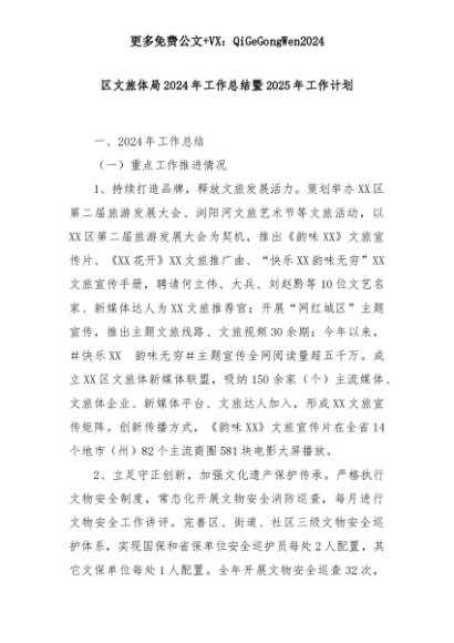 【七哥公文】2025年:区文旅体局2024年工作总结暨2025年工作计划+更多免费公文+VX:QiGeGongWen2024+更多免费公文+VX:QiGeGongWen2024
