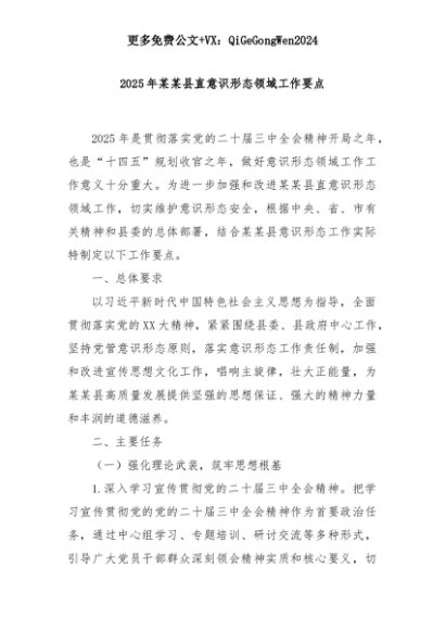 【七哥公文】2025年:2025年某某县直意识形态领域工作要点+更多免费公文+VX:QiGeGongWen2024+更多免费公文+VX:QiGeGongWen2024