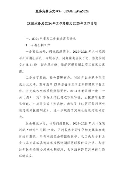 【七哥公文】2025年:XX区水务局2024年工作总结及2025年工作计划+更多免费公文+VX:QiGeGongWen2024+更多免费公文+VX:QiGeGongWen2024