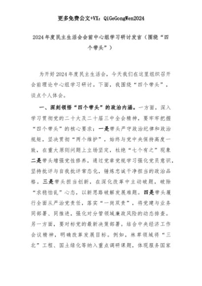 【七哥公文】2025年:2024年度民主生活会会前中心组学习研讨发言(围绕“四个带头”)+更多免费公文+VX:QiGeGongWen2024+更多免费公文+VX:QiGeGongWen2024