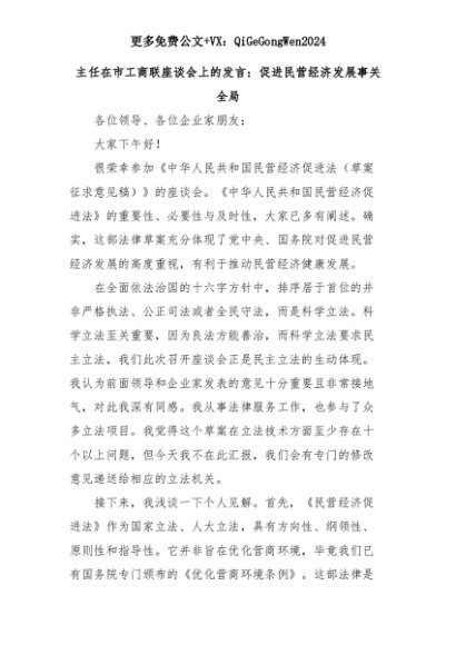 【七哥公文】2025年:主任在市工商联座谈会上的发言:促进民营经济发展事关全局+更多免费公文+VX:QiGeGongWen2024+更多免费公文+VX:QiGeGongWen2024