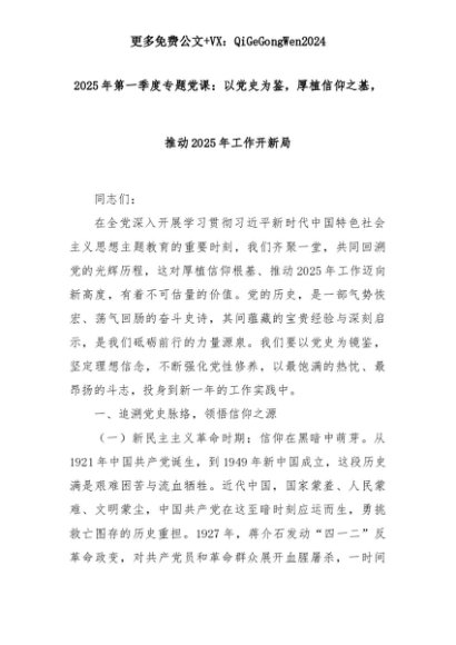 【七哥公文】2025年:2025年第一季度专题党课:以党史为鉴,厚植信仰之基,推动2025年工作开新局+更多免费公文+VX:QiGeGongWen2024+更多免费公文+VX:QiGeGongWen2024