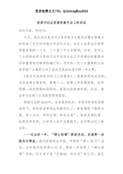 【七哥公文】2025年:党委书记在某高校教代会上的讲话+更多免费公文+VX:QiGeGongWen2024+更多免费公文+VX:QiGeGongWen2024
