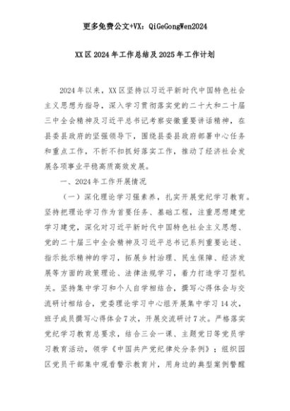 【七哥公文】2025年:XX区2024年工作总结及2025年工作计划+更多免费公文+VX:QiGeGongWen2024+更多免费公文+VX:QiGeGongWen2024