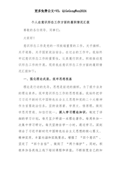 【七哥公文】2025年:个人在意识形态工作方面的履职情况汇报+更多免费公文+VX:QiGeGongWen2024+更多免费公文+VX:QiGeGongWen2024