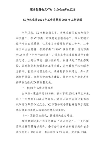 【七哥公文】2025年:XX市林业局2024年工作总结及2025年工作计划+更多免费公文+VX:QiGeGongWen2024+更多免费公文+VX:QiGeGongWen2024