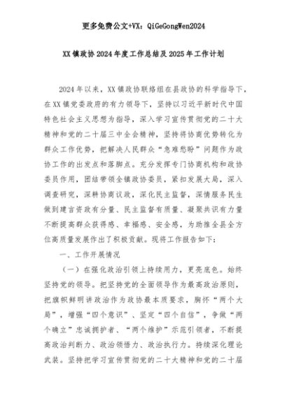 【七哥公文】2025年:XX镇政协2024年度工作总结及2025年工作计划+更多免费公文+VX:QiGeGongWen2024+更多免费公文+VX:QiGeGongWen2024