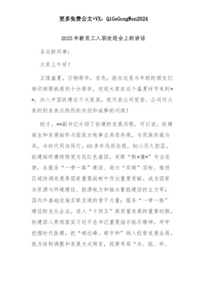 【七哥公文】2025年:2025年新员工入职欢迎会上的讲话+更多免费公文+VX:QiGeGongWen2024+更多免费公文+VX:QiGeGongWen2024
