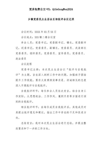 【七哥公文】2025年:乡镇党委民主生活会互相批评会议记录+更多免费公文+VX:QiGeGongWen2024+更多免费公文+VX:QiGeGongWen2024
