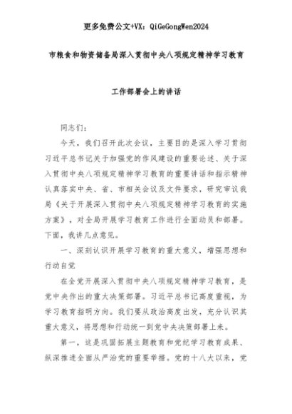 【七哥公文】2025年:市粮食和物资储备局深入贯彻中央八项规定精神学习教育工作部署会上的讲话+更多免费公文+VX:QiGeGongWen2024+更多免费公文+VX:QiGeGongWen2024