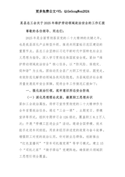 【七哥公文】2025年:某县总工会关于2025年维护劳动领域政治安全的工作汇报+更多免费公文+VX:QiGeGongWen2024+更多免费公文+VX:QiGeGongWen2024