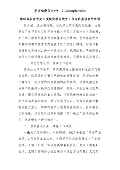 【七哥公文】2025年:组织部长在中央八项规定学习教育工作专班座谈会的讲话+更多免费公文+VX:QiGeGongWen2024+更多免费公文+VX:QiGeGongWen2024
