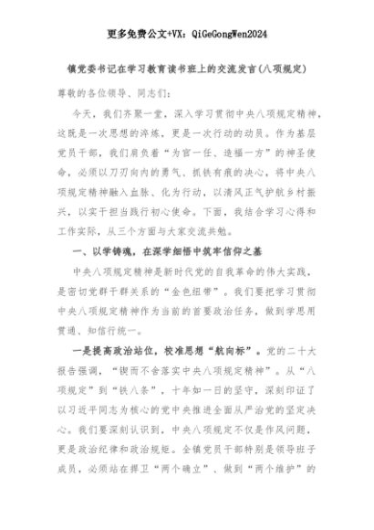 【七哥公文】2025年:镇党委书记在学习教育读书班上的交流发言(八项规定)+更多免费公文+VX:QiGeGongWen2024+更多免费公文+VX:QiGeGongWen2024