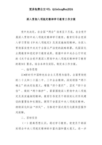 【七哥公文】2025年:深入贯彻八项规定精神学习教育工作方案+更多免费公文+VX:QiGeGongWen2024+更多免费公文+VX:QiGeGongWen2024