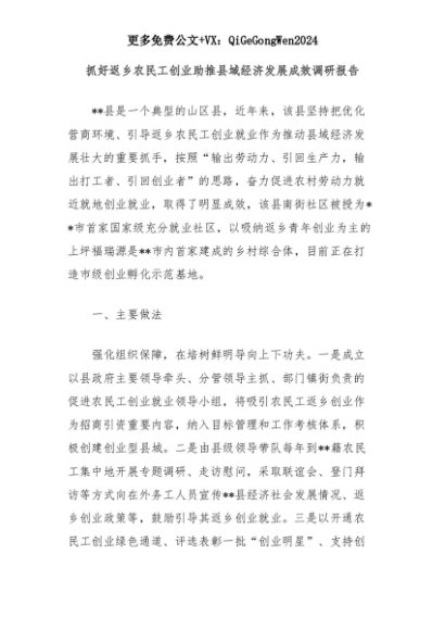 【七哥公文】2025年:抓好返乡农民工创业助推县域经济发展成效调研报告+更多免费公文+VX:QiGeGongWen2024+更多免费公文+VX:QiGeGongWen2024
