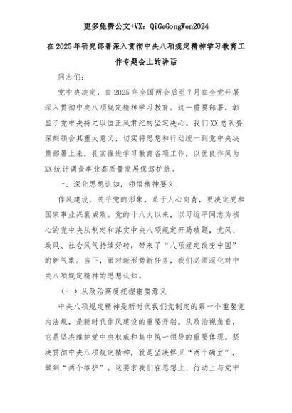 【七哥公文】2025年:在2025年研究部署深入贯彻中央八项规定精神学习教育工作专题会上的讲话+更多免费公文+VX:QiGeGongWen2024+更多免费公文+VX:QiGeGongWen2024