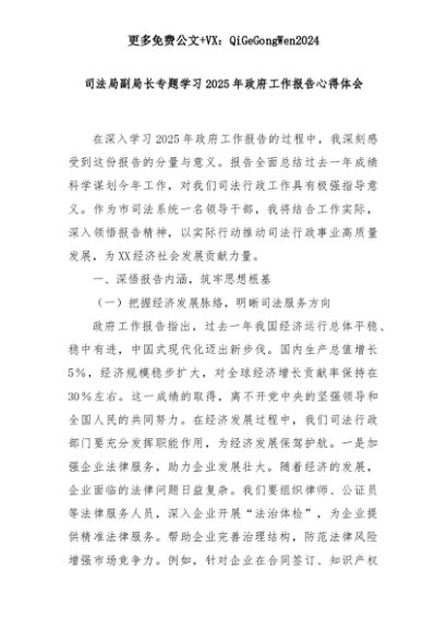 【七哥公文】2025年:司法局副局长专题学习2025年政府工作报告心得体会+更多免费公文+VX:QiGeGongWen2024+更多免费公文+VX:QiGeGongWen2024