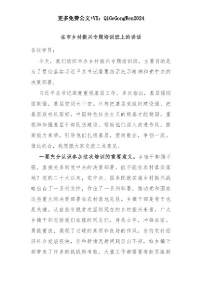 【七哥公文】2025年:在市乡村振兴专题培训班上的讲话+更多免费公文+VX:QiGeGongWen2024+更多免费公文+VX:QiGeGongWen2024